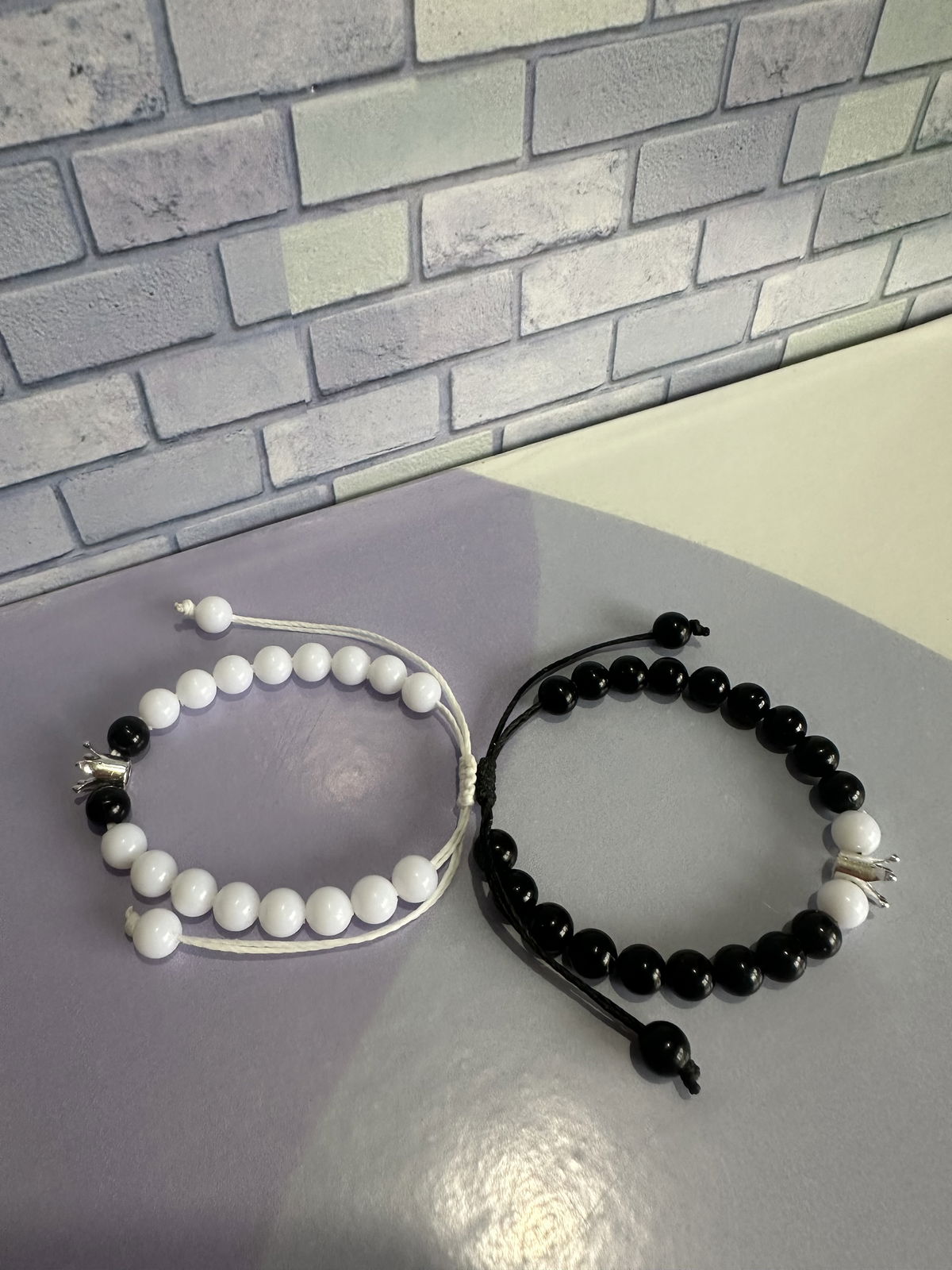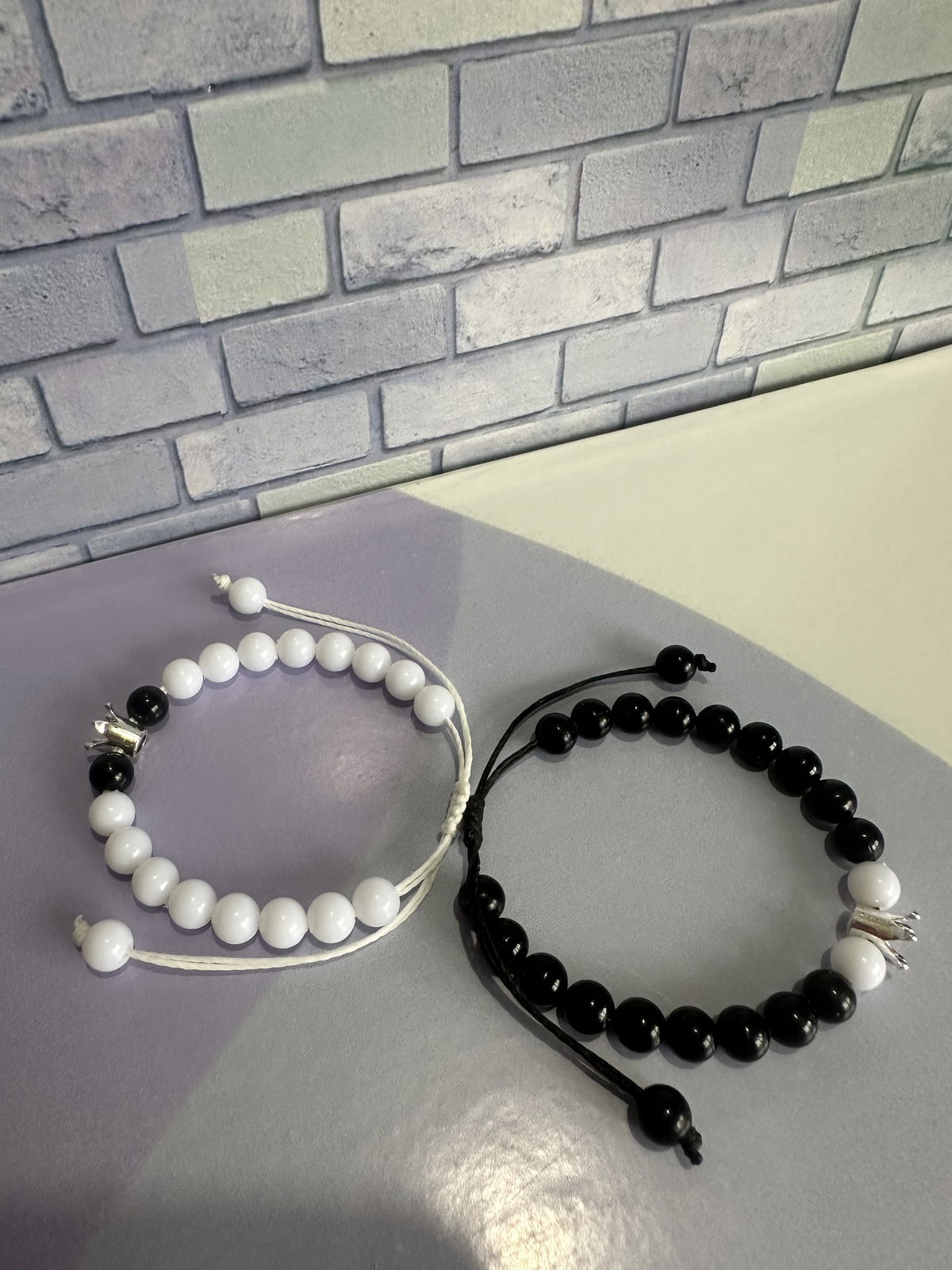 •Materiales: perlas brillantes de 6mm con hilo encerado y dije de corona de fundición